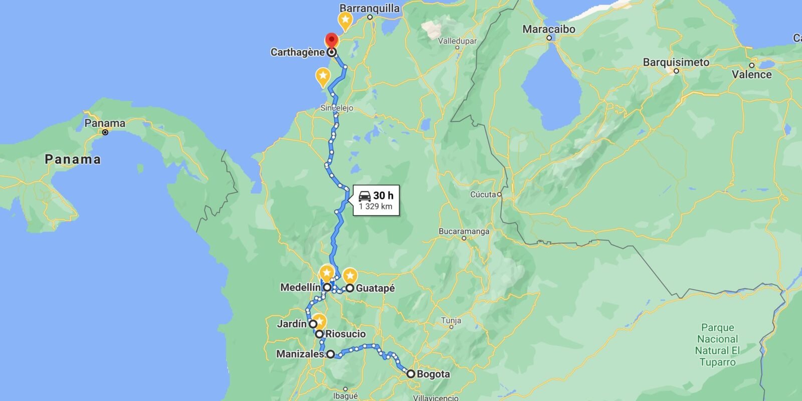 La carte google Map s’arrête à Nécocli car elle est limitée en nombre de destinations cumulable ET ne connait pas le Darien Gap/